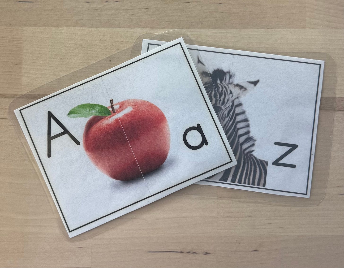 The first step is to get some alphabet picture cards. I wanted real images to represent each letter and had both the upper and lower case letters on there. The words I typed in to find some free resources were, “free printable alphabet flash cards with real images”.